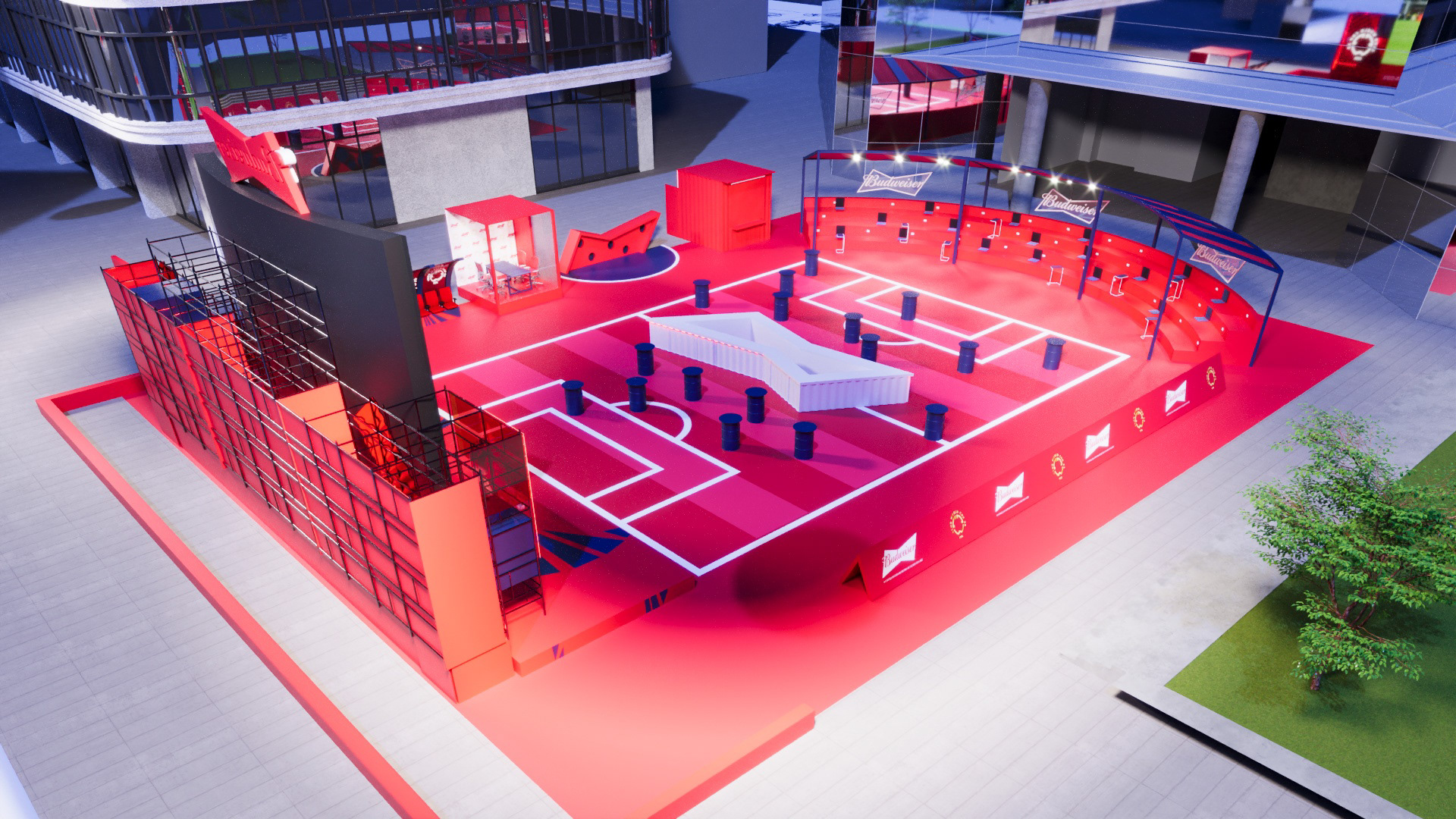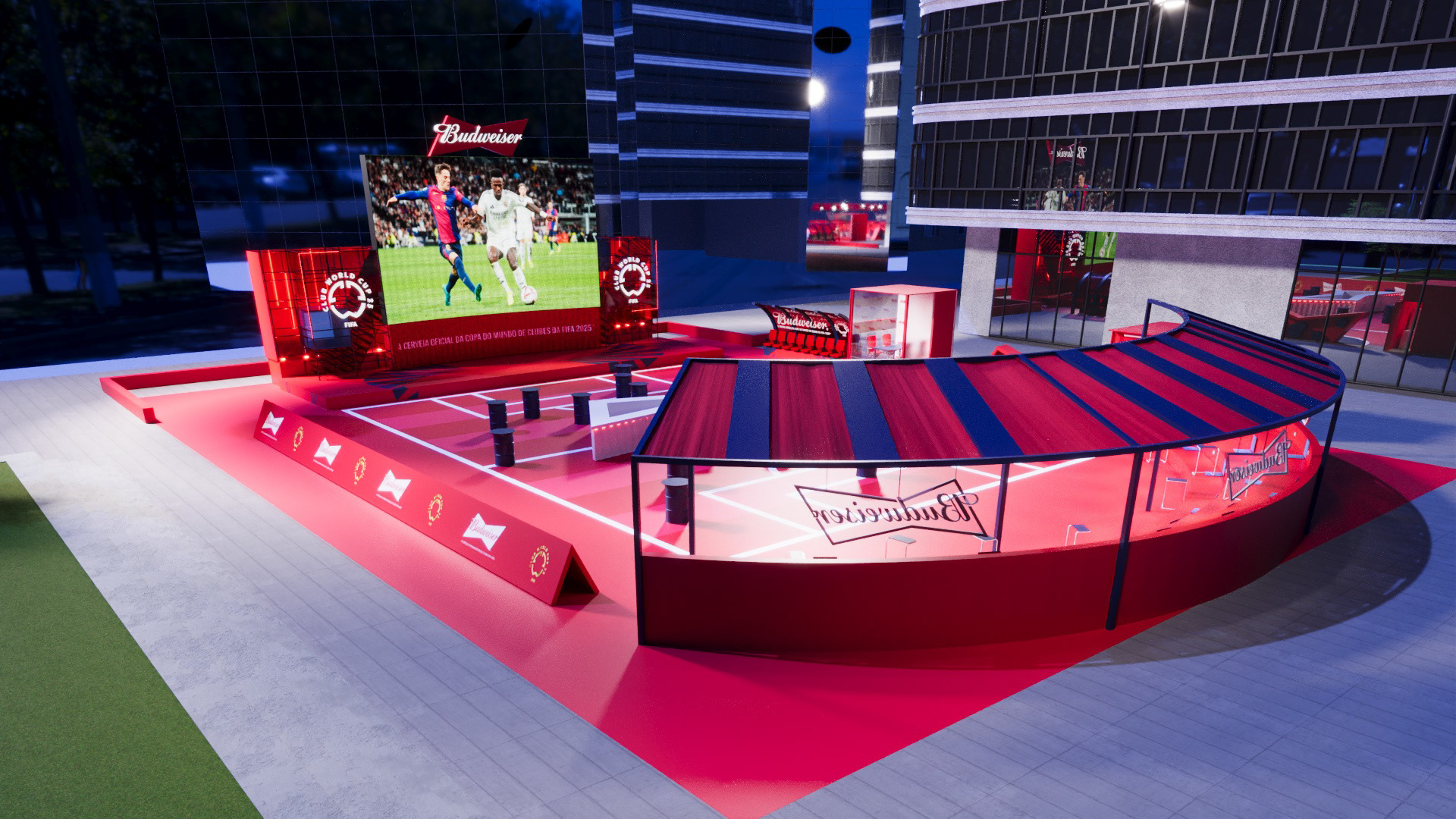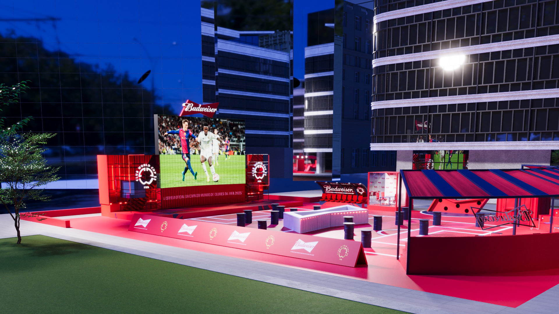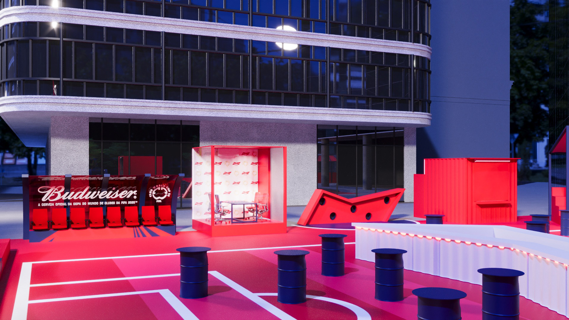 Project created for Budweiser during the FIFA Club World Cup, developing a space in the heart of Faria Lima where people could watch the tournament matches during work hours.